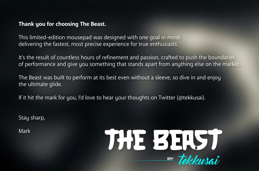 Introducing ‘The Beast’ A limited-edition glass mousepad engineered to offer the fastest glide with no skin stickiness. At just 2.5mm thin, it lays low and stays out of your way. Comes in at a generous 500x450mm size, and with a hand drawn design. Each piece will be individually numbered. Inside the box, will also be Tekkusai’s favorite skates, the Silver Fox from Unusual Way Sports, for a fully curated glide experience. This is Tekkusai’s very own release, not tied to any brand. It is a passion project, made by an enthusiast for other enthusiasts.